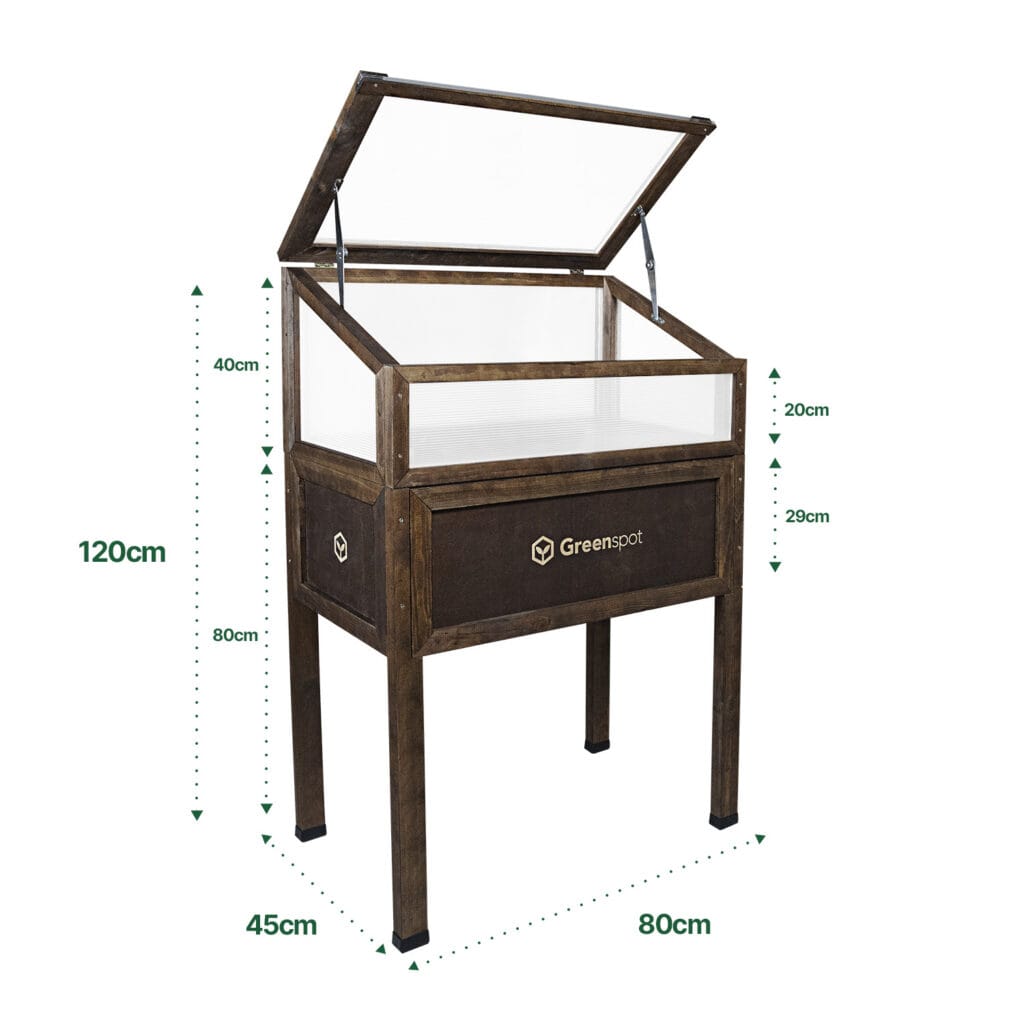 Mała szklarnia na podwyższeniu charakteryzuje się także większą wygodą sadzenia i uprawy roślin niż tradycyjne formy. Skrzynia posiada wysokość 80cm i została dostosowana do wysokości dorosłego człowieka, dzięki czemu nie ma konieczności nadmiernego schylania się podczas sadzenia. W ten sposób nie obciążasz pleców podczas pracy, a sadzenie i pielęgnacja roślin jest czystą przyjemnością.