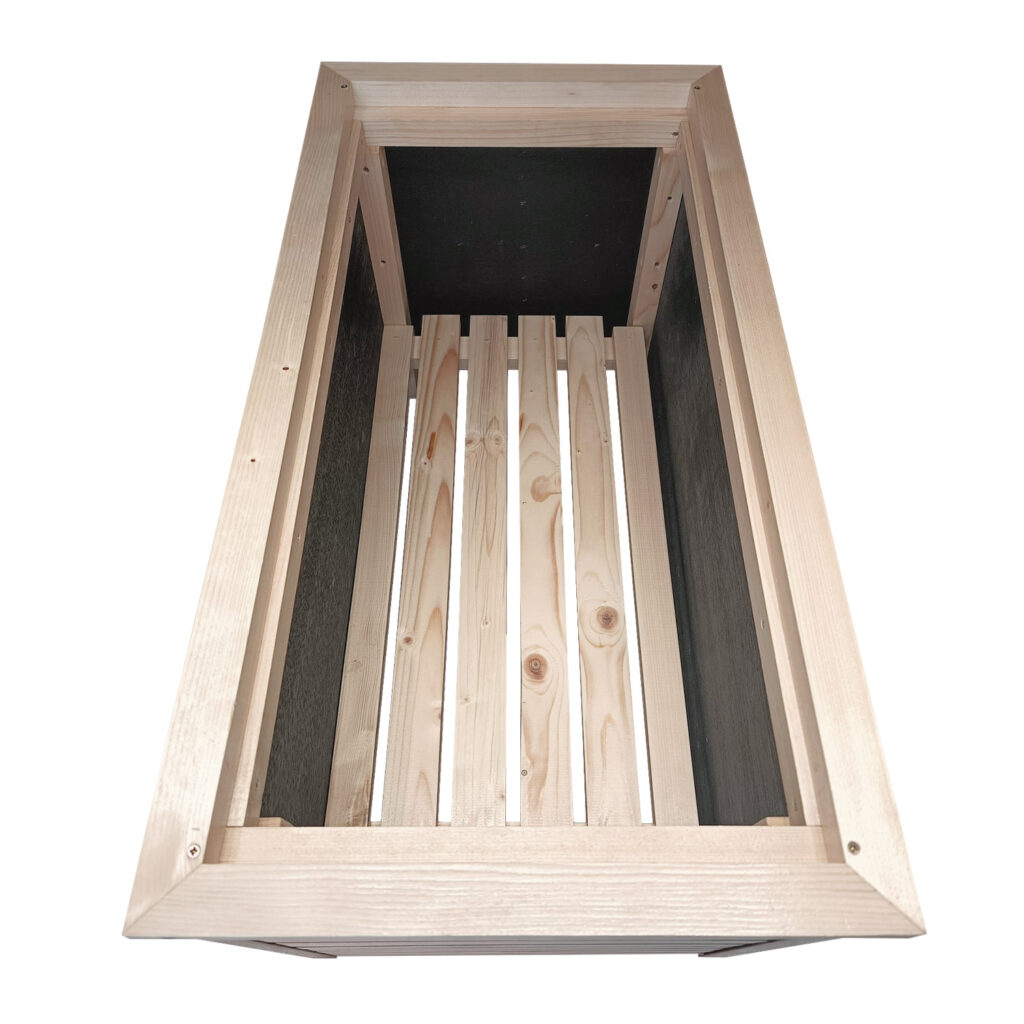 Donica została wykonana z dbałością o każdy detal, łącząc w sobie piękno naturalnego drewna z solidną konstrukcją. Lamele świerkowe są starannie przytwierdzone do grubej, wodoodpornej sklejki, a całość zabezpieczona impregnatem żywicznym. Dzięki temu donica jest odporna na warunki atmosferyczne i nie wymaga malowania przez okres do 7 lat!